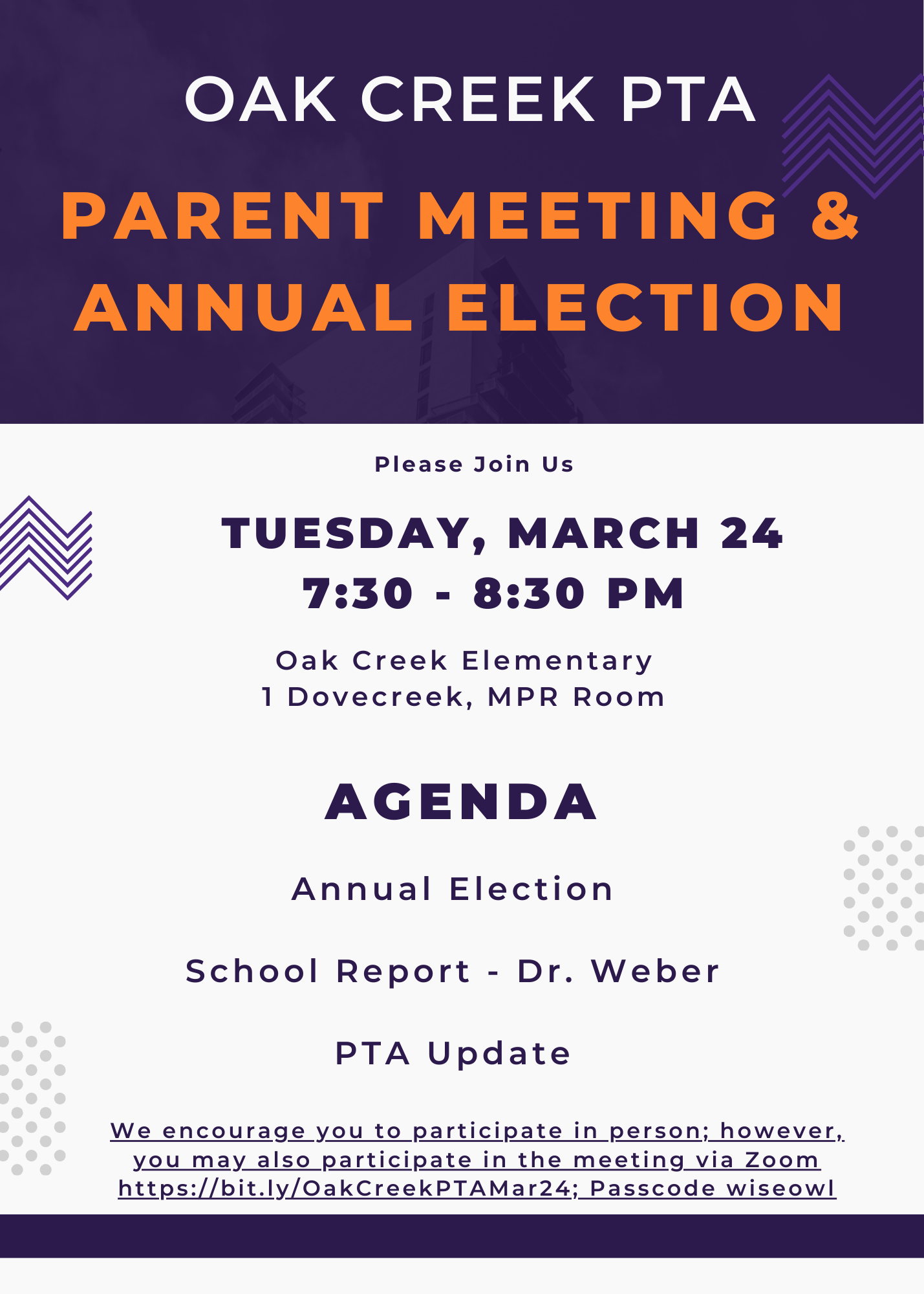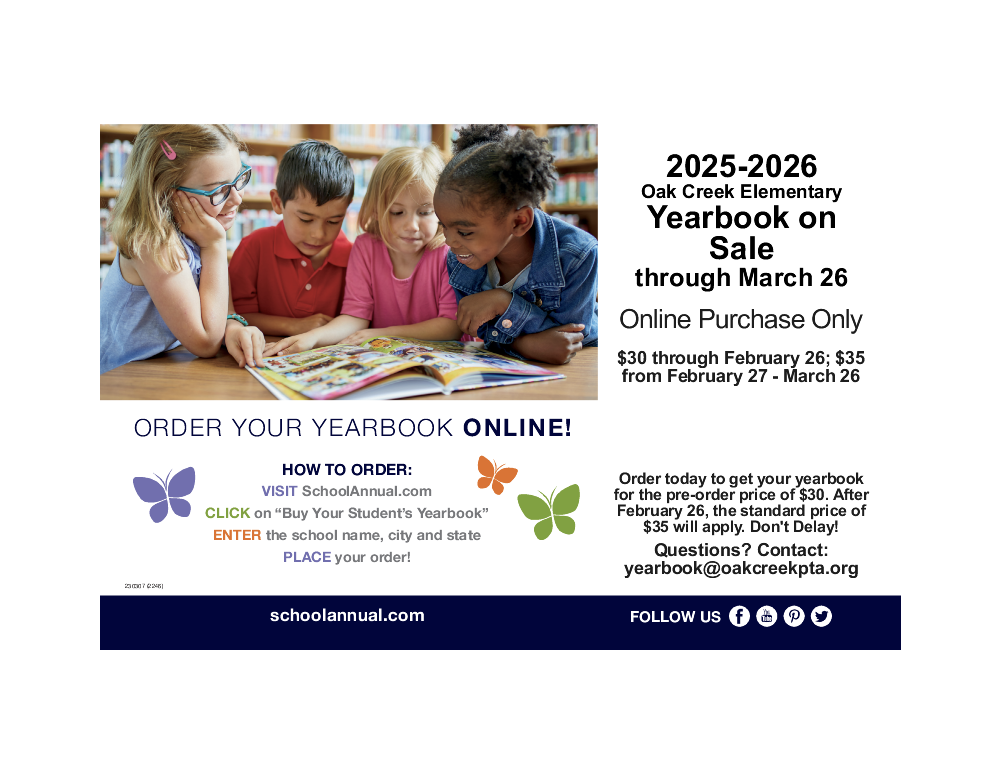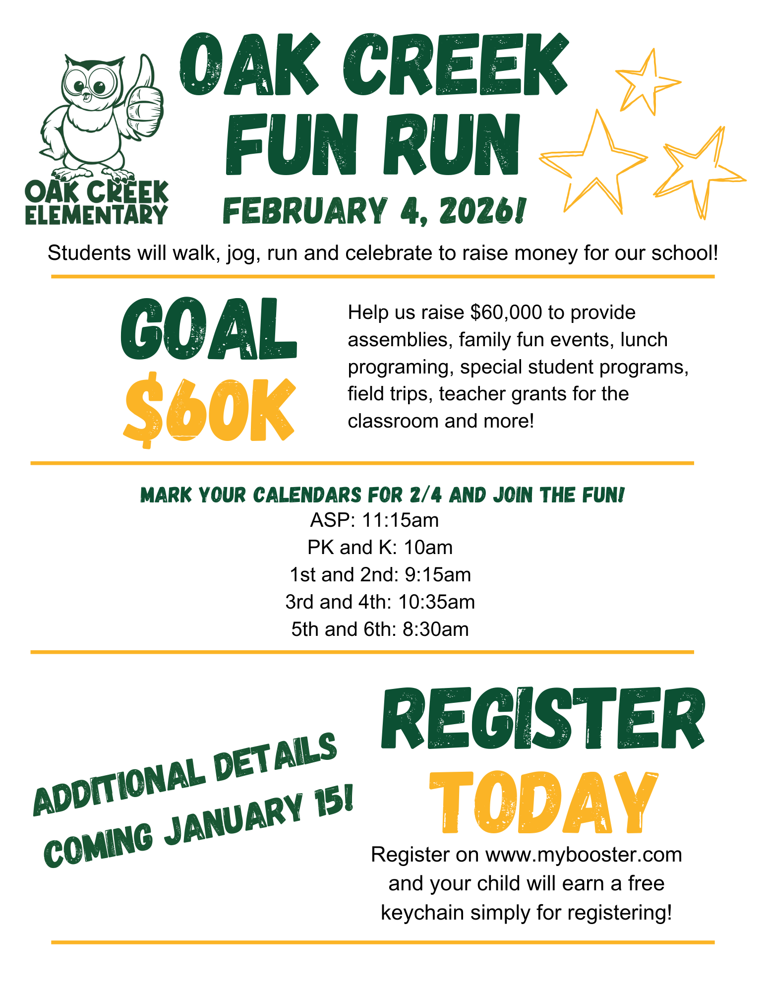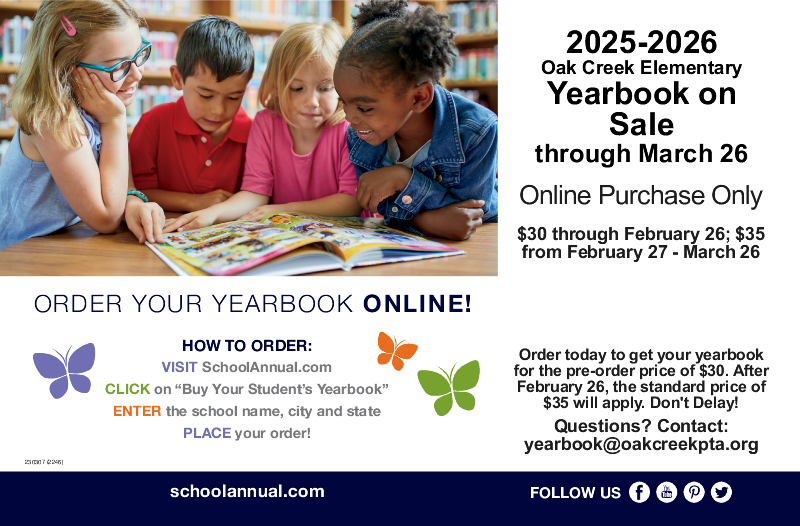 Please consider donating to Oak Creek PTA to help support student programming at Oak Creek Elementary. All donations are tax deductible.