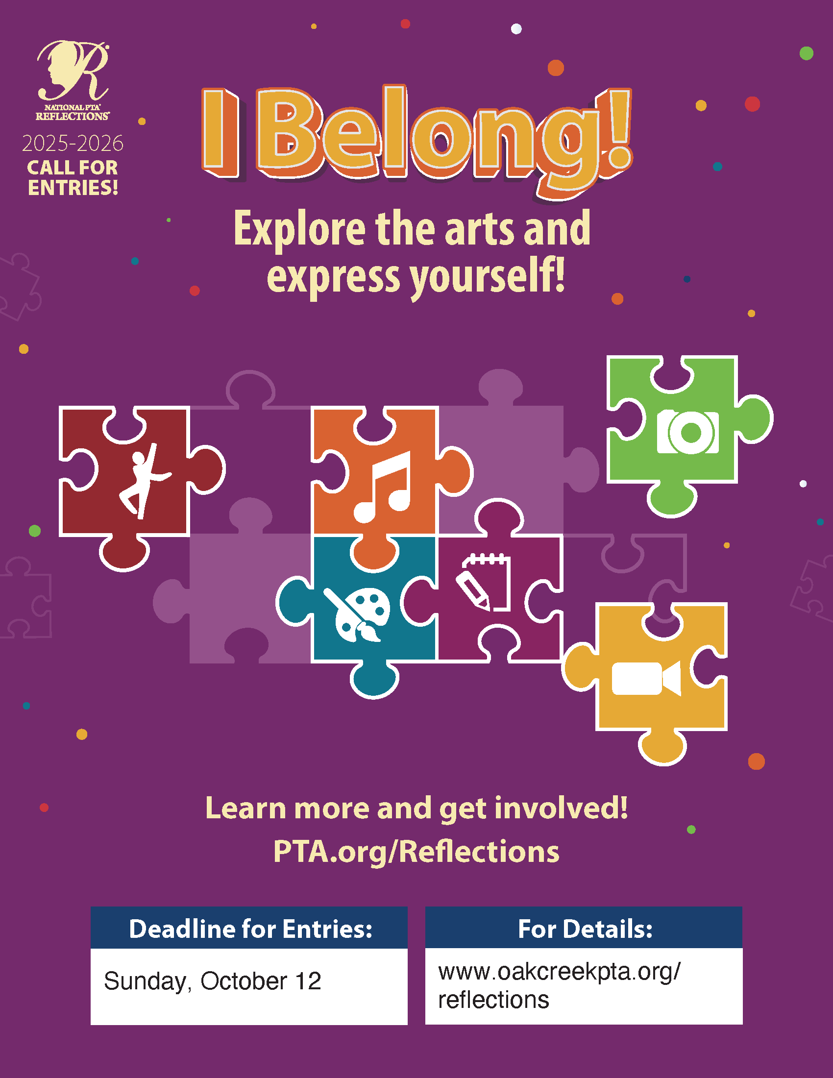 The 2025 Reflections Arts Program celebrating student creativity is now underway. All students attending Oak Creek Elementary are invited to participate and submit original artwork in one of six areas: Dance Choreography, Literature, Photography, Film Production, Music Composition and Visual Arts. (Students can enter in more than one category but entries are limited to one per category.)